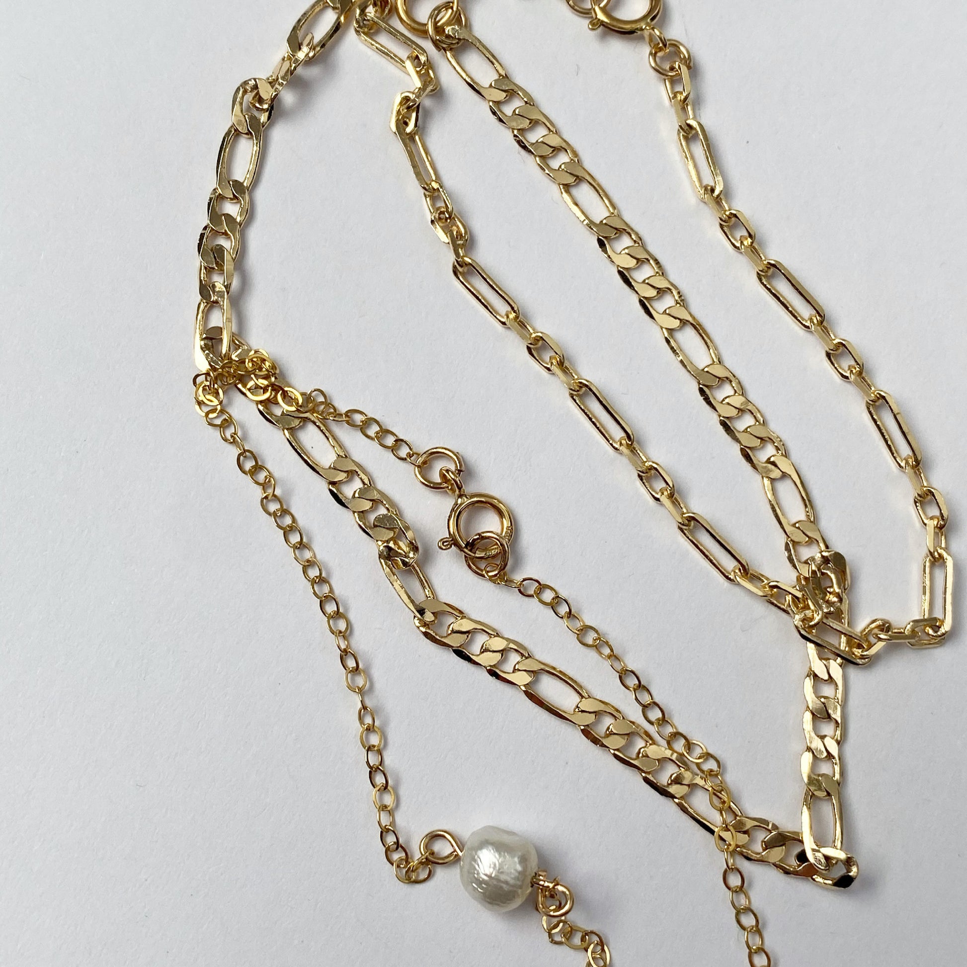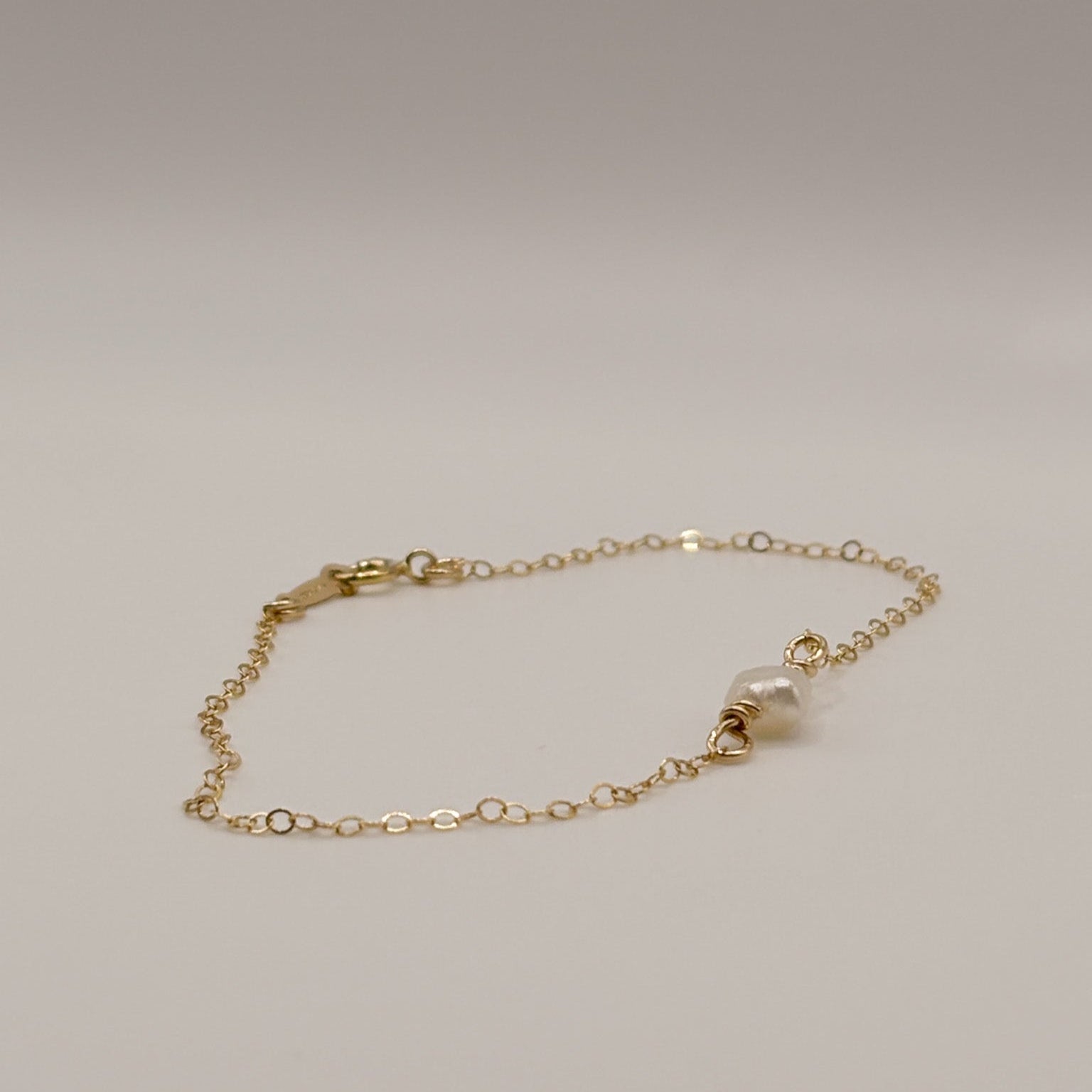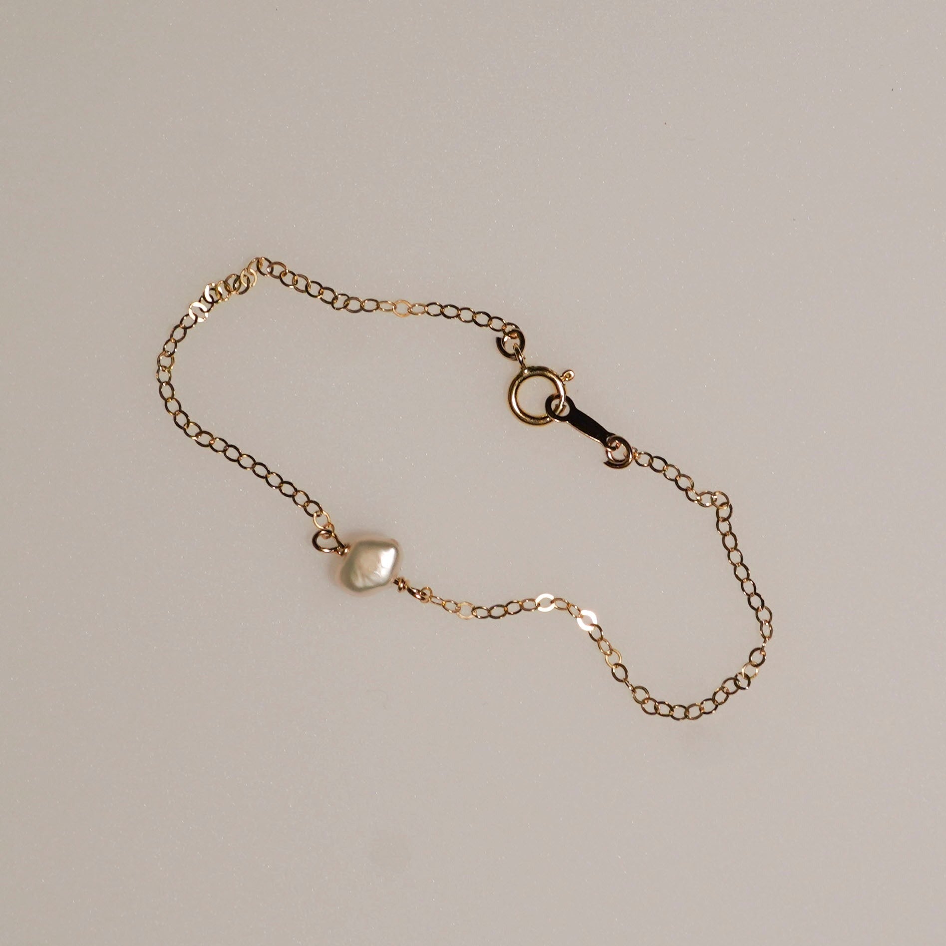 This is made with a cultured pearl and gold filled materials. It is safe to wear in water, but should stay away from chemicals like soaps, lotions, and perfumes.