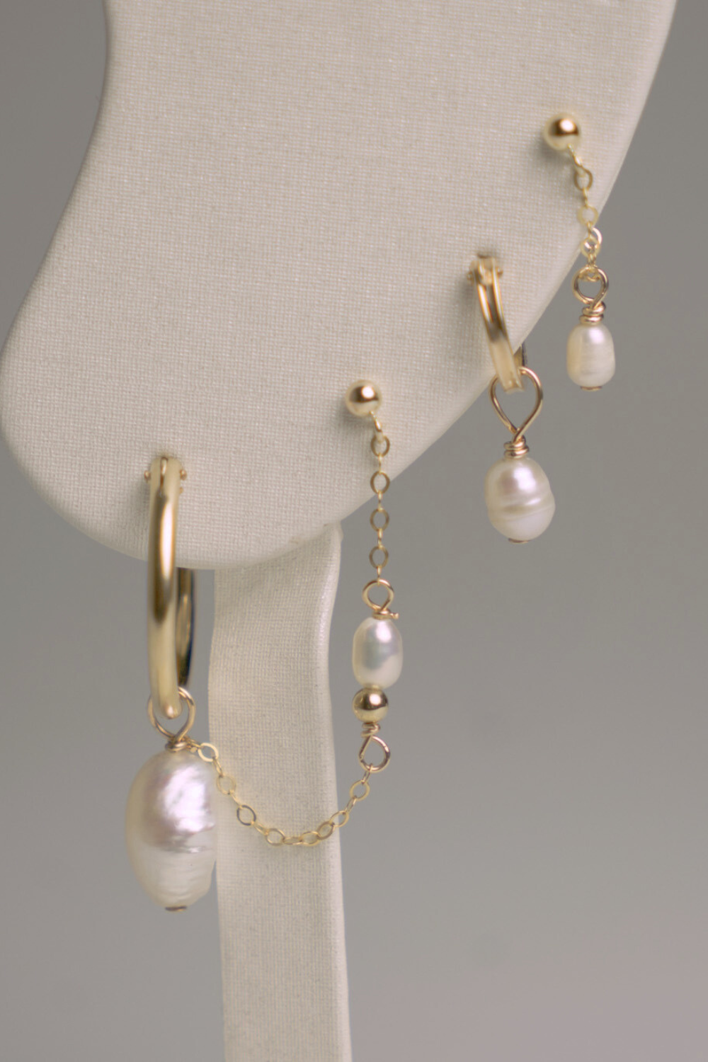 The Margaret Hoops, but better! These pearl hoops are connected to a stud by chain and pearls, perfect for multiple piercings.
