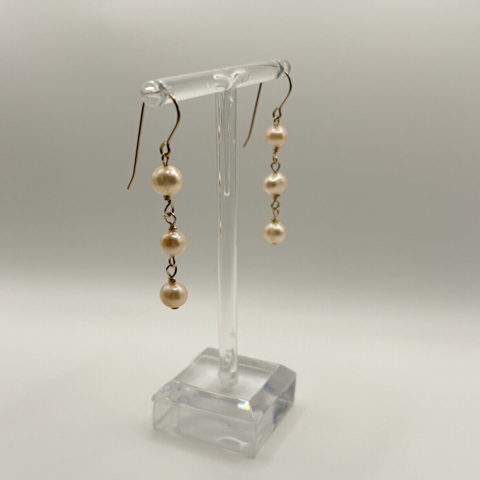 Gold filled hook earrings with three round pearls linked together.