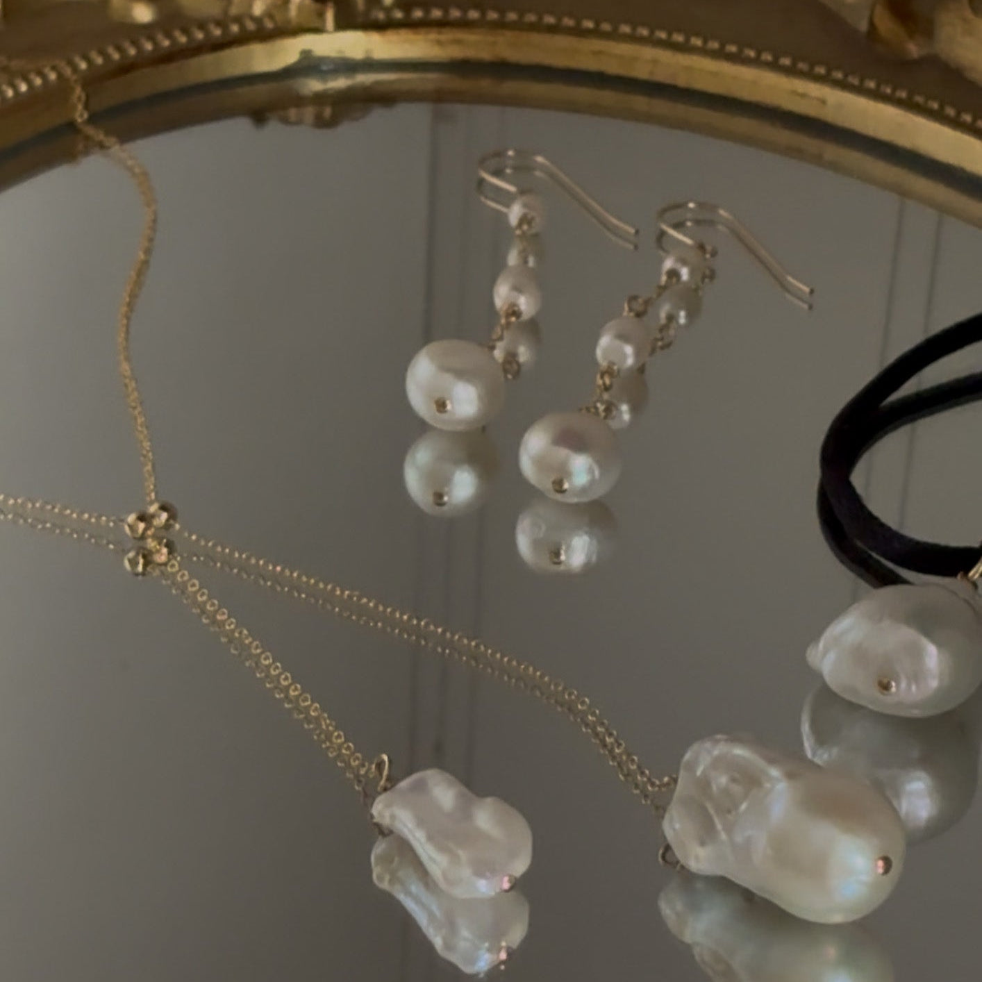 This piece is crafted with freshwater pearls and gold-filled materials—a thick layer of gold bonded over a base metal. It’s hypoallergenic, tarnish-resistant, and safe to wear in water. To preserve its shine, avoid direct contact with chemicals found in soaps, lotions, and perfumes.