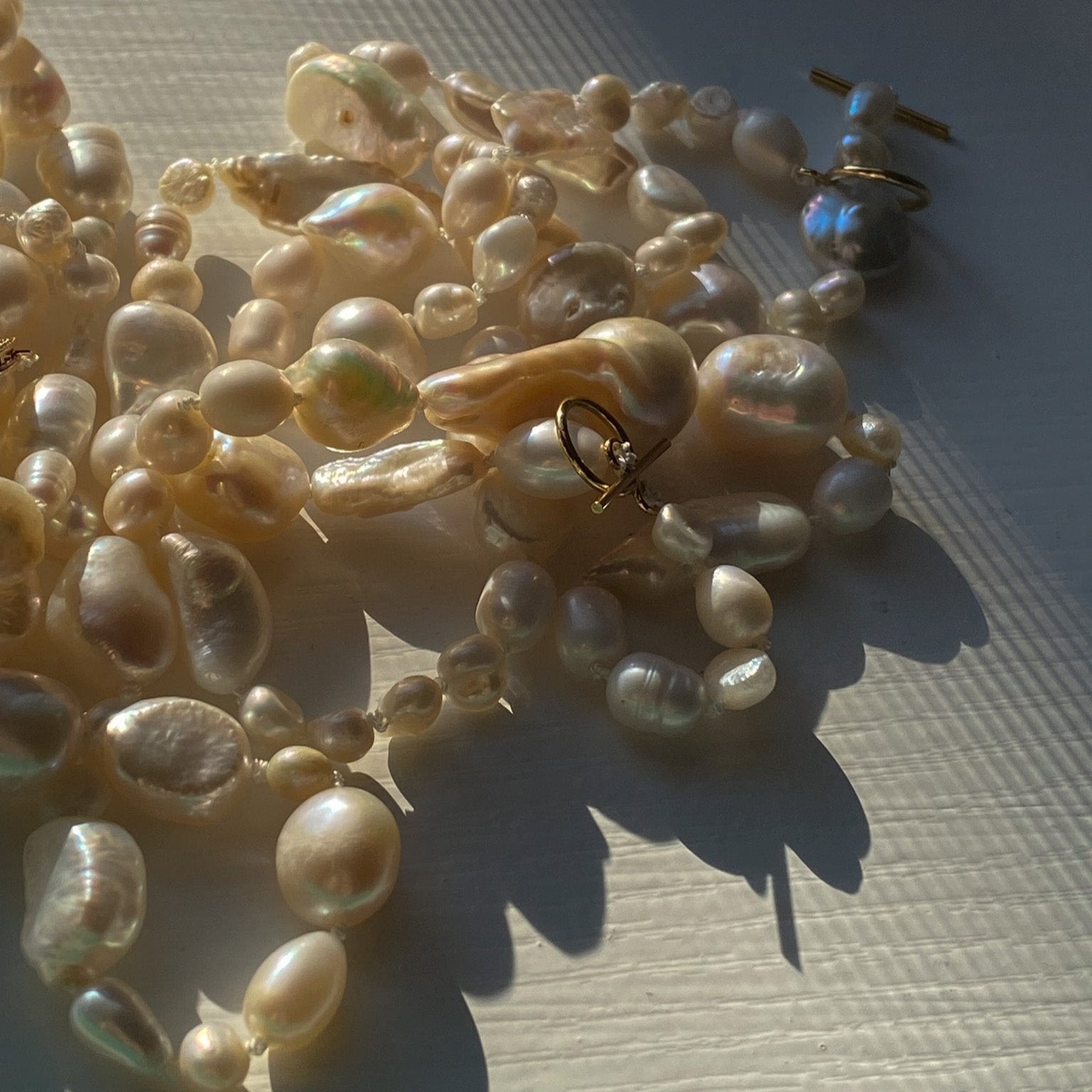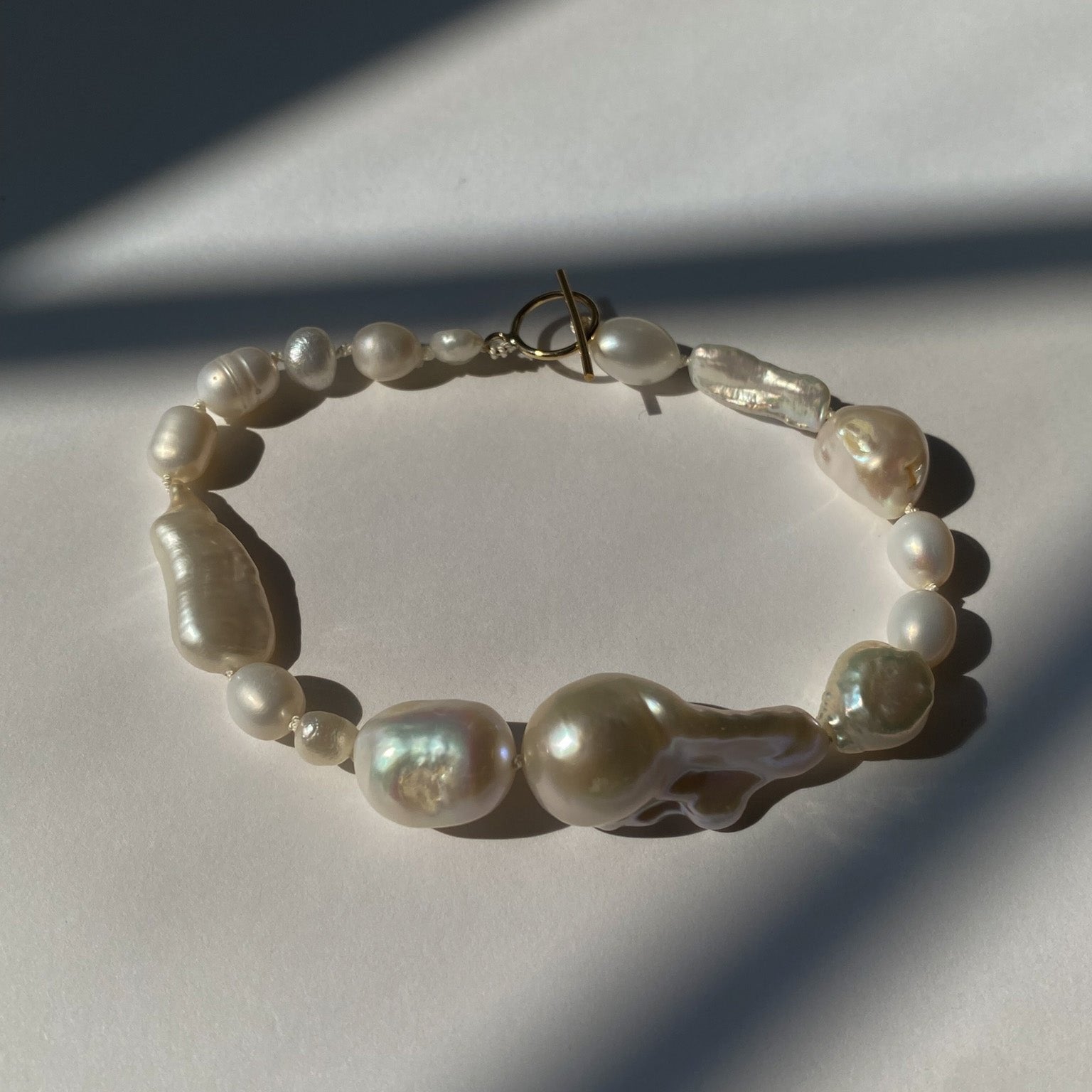 A handmade pearl bracelet made with unique pearls for a modern twist on a classic piece.