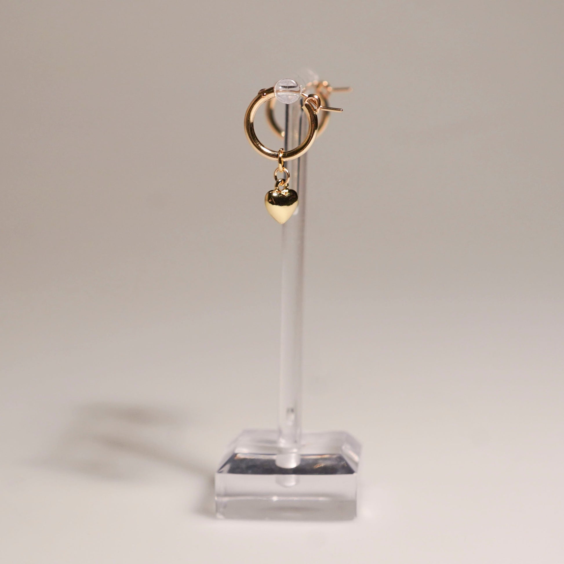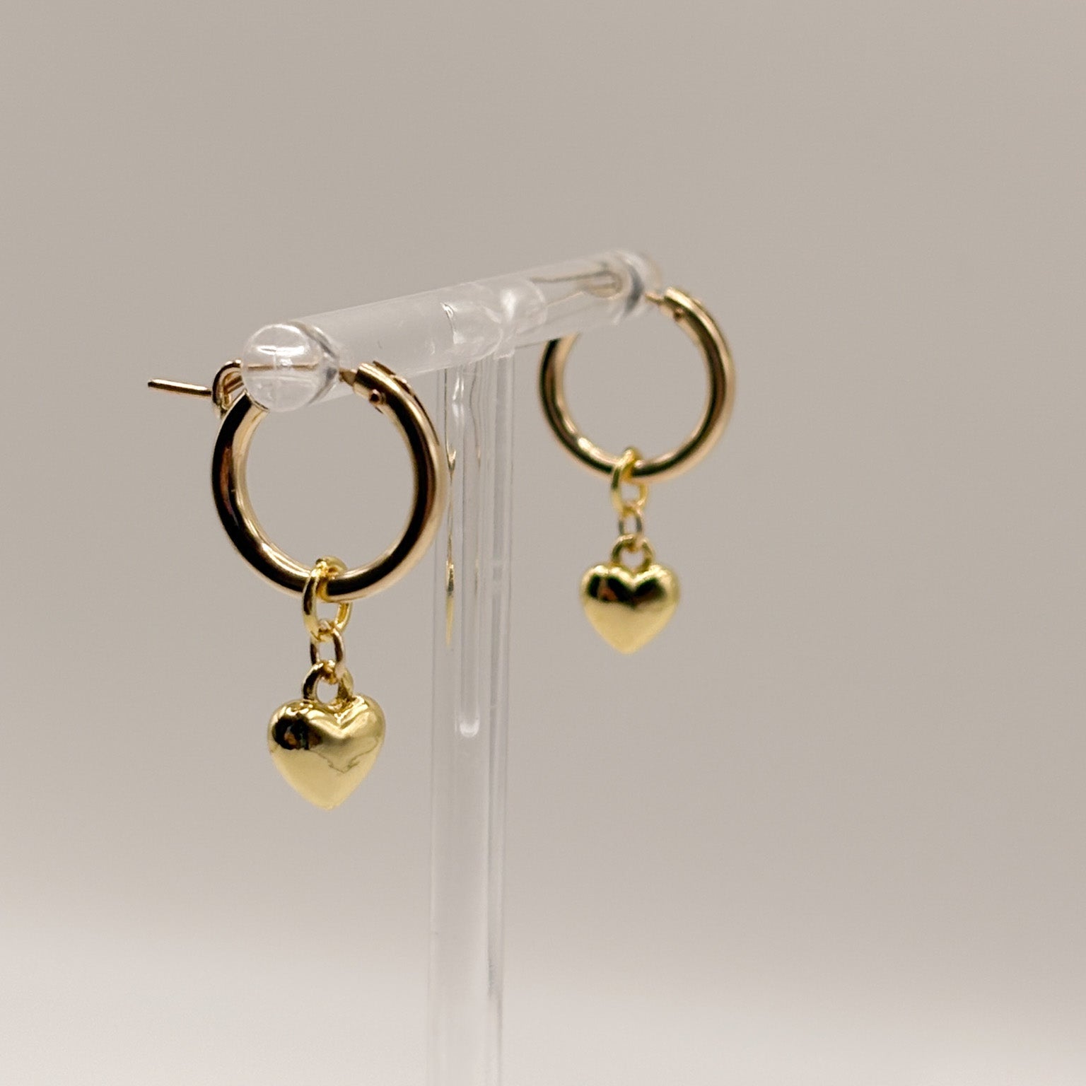 The cutest gold hoops with small gold heart charms.