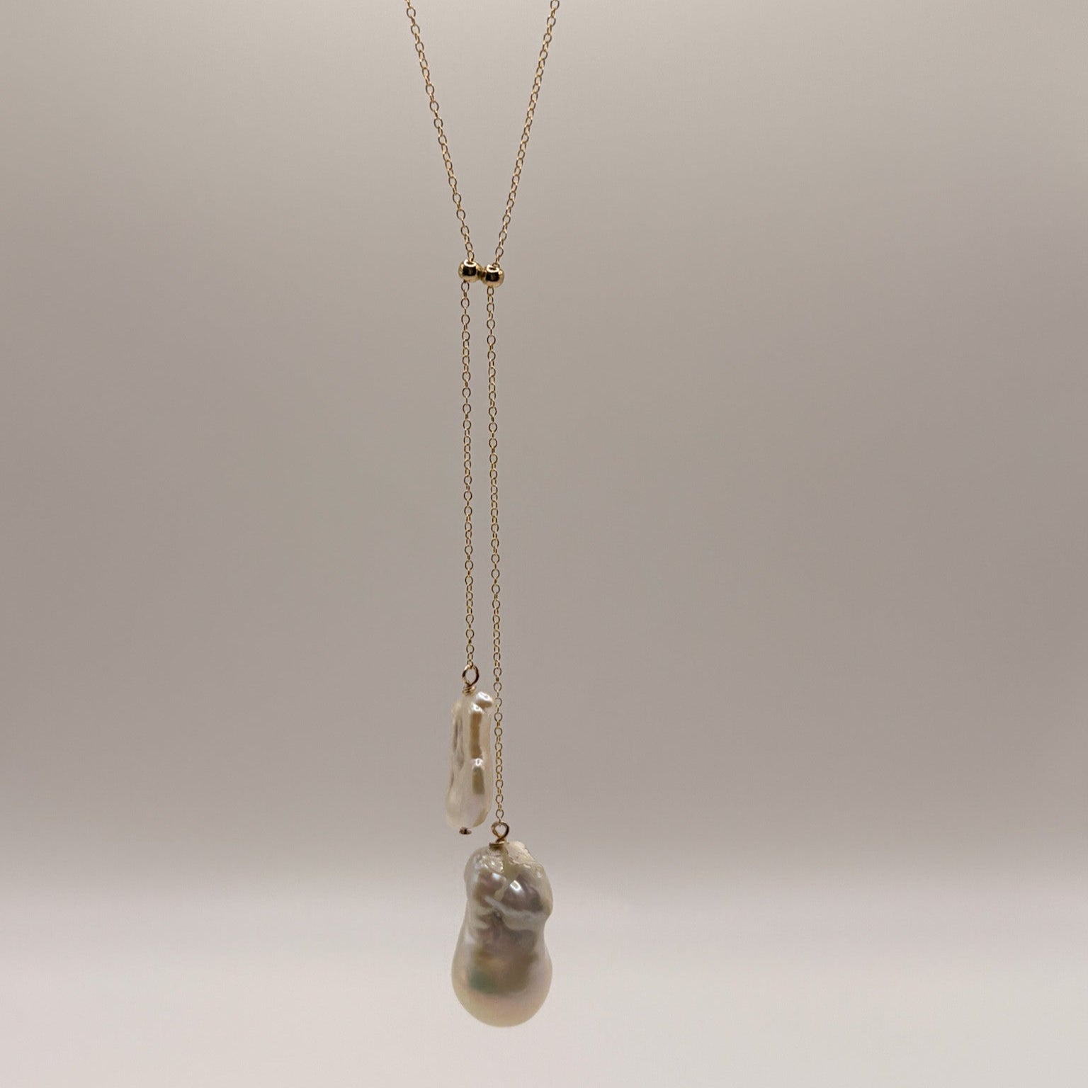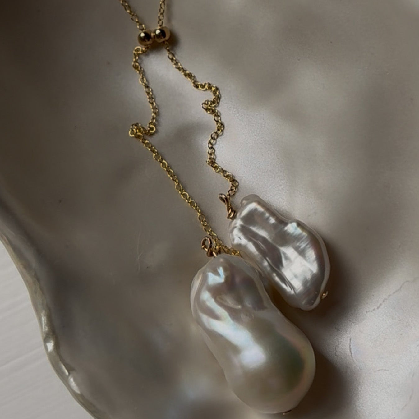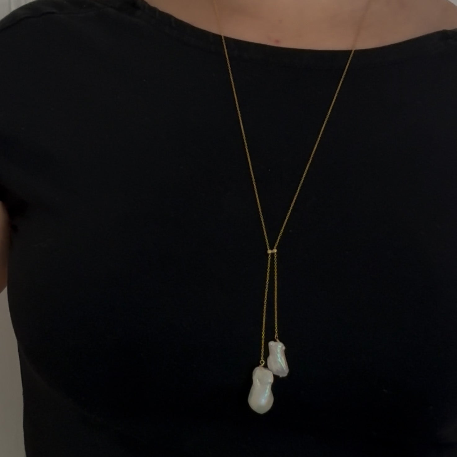 A beautifully unique and customizable ‘Y’ necklace, featuring two one-of-a-kind baroque pearl charms. Designed without a traditional clasp, this necklace adjusts effortlessly with a sliding bead, allowing you to customize the length up to 28 inches. Elegant, versatile, and perfect for layering or wearing solo.