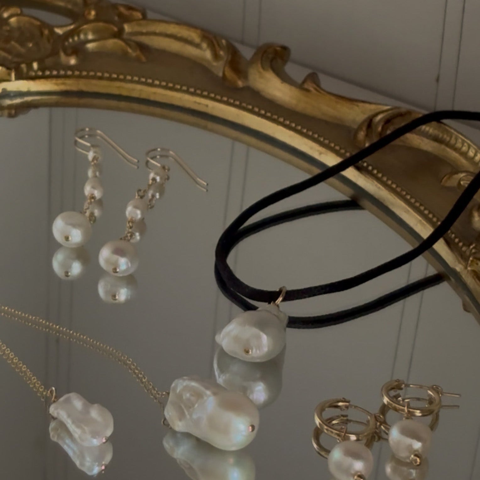 This piece is crafted with freshwater pearls and gold-filled materials—a thick layer of gold bonded over a base metal. It’s hypoallergenic, tarnish-resistant, and safe to wear in water. To preserve its shine, avoid direct contact with chemicals found in soaps, lotions, and perfumes.